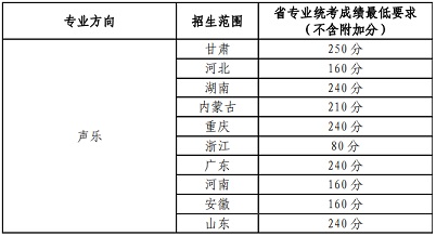 只招收美聲和民族唱法的考生。考生自身身心健康狀況不影響專業表演、演唱和學習,無發聲器官疾病,符合《普通高等學校招生體檢工作指導意見》及有關補充規定要求。