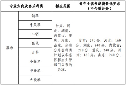 專業考試器樂種類須與我校招生專業對應的器樂種類完全匹配,否則不予錄取。無影響器樂演奏的生理缺陷。考生自身身心健康狀況不影響專業表演、演奏和學習,符合《普通高等學校招生體檢工作指導意見》及有關補充規定要求。