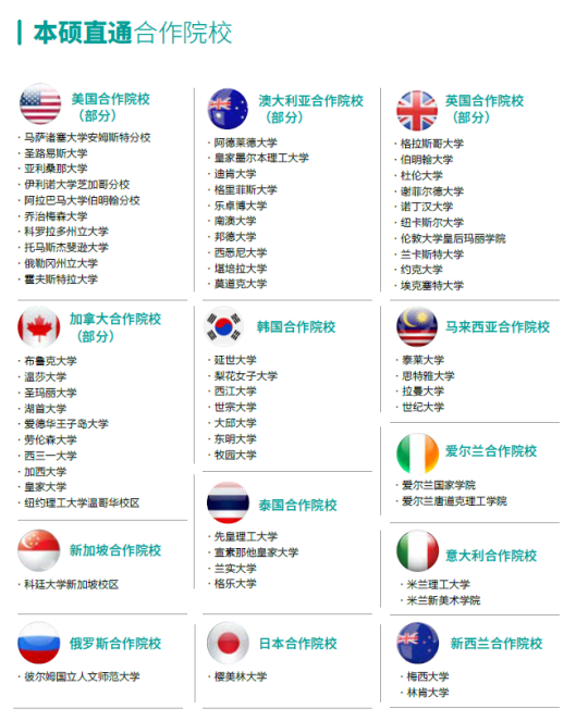 為進一步滿足學生高層次學習的個性化需求,為學校學子搭建“高端化、全球化、個性化”的教育平臺,幫助學生實現“本碩直通、名校讀研”繼續深造的目標,學校與英、美、澳、加、日、韓、法等國家的百余所知名高校深度合作,針對學生個性特點,制定國際化人才培養方案,指導學生提高學習能力,使 GPA 符合海外目標院校的要求。開展跨文化培養、學術研究培養、雅思英語學習等課程,在完成本科專業的同時,達到國外大學碩士錄取條件,獲得銀川科技學院本科文憑后,繼續到國外名校完成碩士階段學業,實現“國內本科 + 國外碩士”直通的目標。