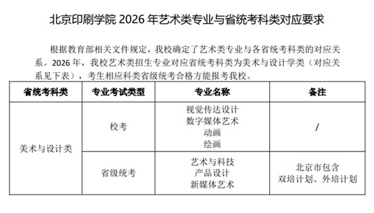北京印刷學院2026年藝術類專業(yè)與省統(tǒng)考科類對應要求