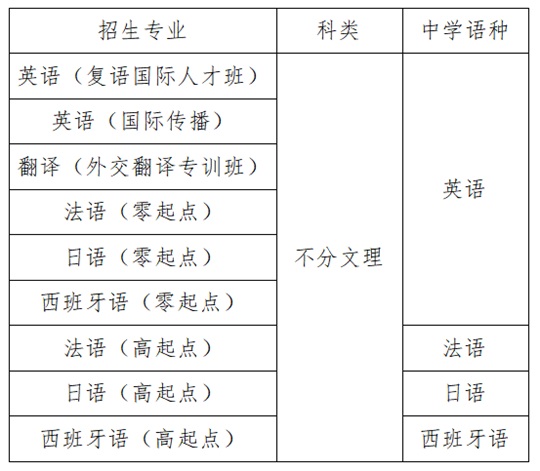 第六條 經(jīng)教育部批準(zhǔn)具有推薦保送生資格的外國語中學(xué)中具有保送生資格,符合當(dāng)年高考報(bào)名條件,身心健康,品學(xué)兼優(yōu),德智體美勞全面發(fā)展,有志于從事外交外事、翻譯、國際問題研究、涉外法律、經(jīng)濟(jì)、文化交流和國際傳播工作的應(yīng)屆高中畢業(yè)生。