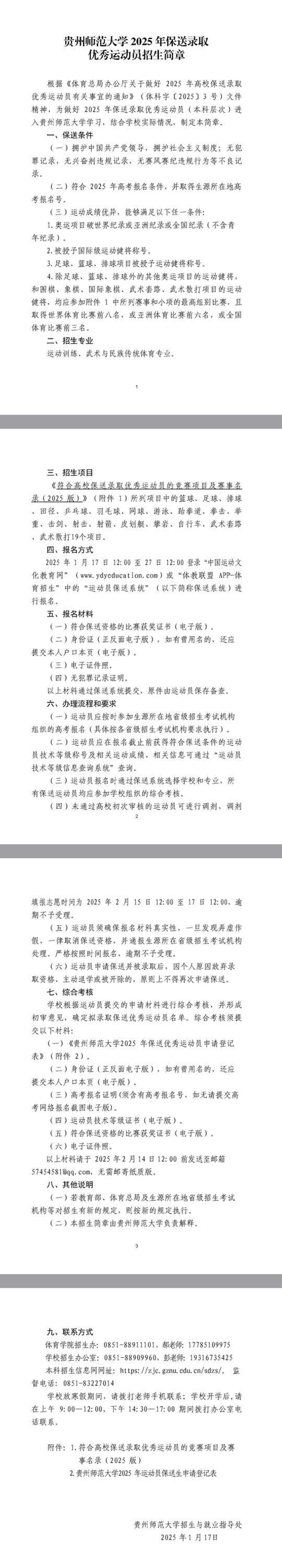 貴州師范大學2025年保送錄取優秀運動員招生簡章
