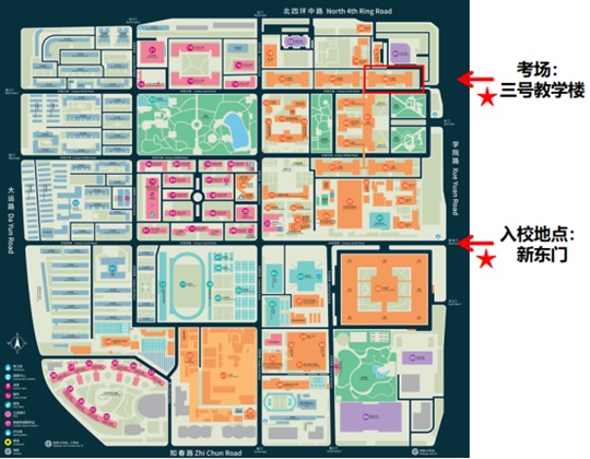 考點:北航學院路校區(qū)(北京市海淀區(qū)學院路37號),考生由新東門入校,由三號樓正門進入考場(見下圖)。