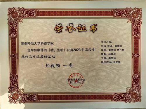 由董墨涵、費丹楊、楊青彥、李墨涵等同學一起創作,張藝加老師指導的《噓,別聽》獲得短視頻類一類作品獎項。