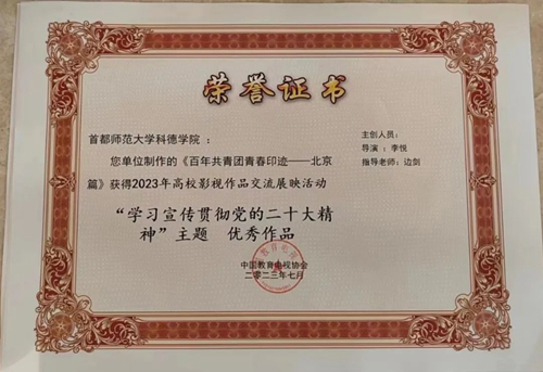由李悅同學創作,邊劍老師指導的《百年共青團青春印記--北京篇》獲得專題片類二類作品獎項、學習宣傳貫徹黨的二十大精神主題視頻專題片類二類獎項。