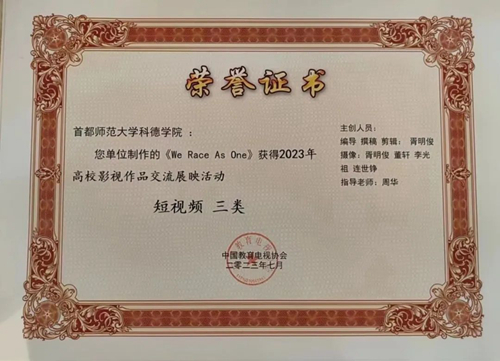 由胥明俊、董軒、李光祖、連世錚等同學一起創作,周華老師指導的《WeRaceAsOne》獲得短視頻類三類作品獎項。