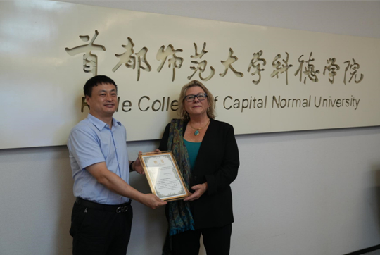 隨后,首都師范大學科德學院黨委書記兼常務副校長徐振劍為Carol Humphreys校長頒發國際導師聘書。