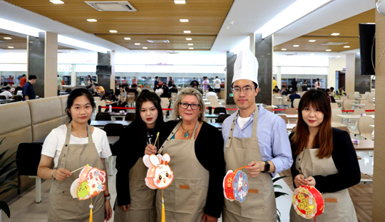 在校園餐廳,學校為遠道而來的Carol Humphreys校長一行安排了DIY手作月餅和制作中秋節花燈的活動。首都師范大學科德學院部分師生一同與索菲亞大學校長一行留下科德美食記憶。