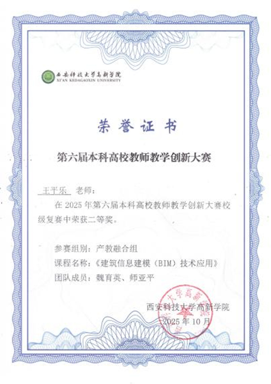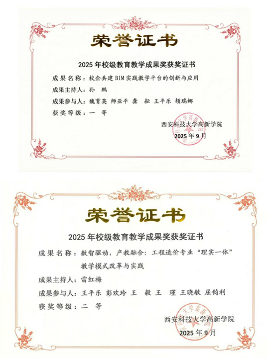 教學改革持續深化,創新成果亮點紛呈。在2025年校級教育教學成果獎評選中,科技與工程學院牽頭完成的“校企共建BIM實踐教學平臺的創新與應用”榮獲一等獎,“數智驅動,產教融合:工程造價專業‘理實一體’教學模式改革與實踐”斬獲二等獎,集中體現了學院在BIM實踐教學平臺構建、課程體系優化、理實一體化改革等方面的深入探索與顯著成效。在第六屆本科高校教師教學創新大賽中,王平樂老師領銜、魏育英、師亞平參與的《建筑信息建模(BIM)技術應用》課程,憑借鮮明的產教融合特色與創新的教學方法,榮獲產教融合組二等獎,進一步印證了學院BIM課程建設的高水平與教學創新的持續突破。