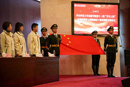 隨后,西安科技大學高新學院副院長王國良授予第十一期“青馬工程”培訓班班旗。班旗飄揚,使命在肩。這面旗幟不僅是“青馬工程”學員的團結象征,更凝聚著延安精神中自力更生、艱苦奮斗的創業力量。