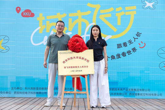 作為本次活動(dòng)的重頭戲,在與會(huì)嘉賓的共同見(jiàn)證下,西安科技大學(xué)高新學(xué)院共青團(tuán)團(tuán)委代表明楚楚與通航協(xié)會(huì)會(huì)長(zhǎng)李磊先生共同為"智飛創(chuàng)客聯(lián)盟"無(wú)人機(jī)社團(tuán)揭牌。這一由陜西省無(wú)人機(jī)協(xié)會(huì)指導(dǎo)的副屬社團(tuán),開(kāi)創(chuàng)性地融合了"產(chǎn)、學(xué)、研、用"四位一體培養(yǎng)模式。