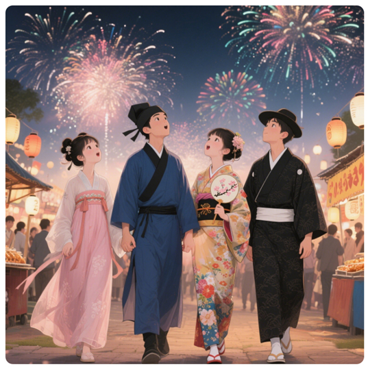 中日大學(xué)生還以“中國與日本朋友共同看煙花”為主題,分小組利用AI繪圖工具聯(lián)手創(chuàng)作。小組成員結(jié)合兩國煙花文化特色,輸入關(guān)鍵詞生成多幅融合元素的作品。絢麗的櫻花與牡丹交織、分別穿著和服和漢服等兩國傳統(tǒng)服飾的人物并肩賞景的畫面,寄托了青年一代對中日友好未來的期許。
