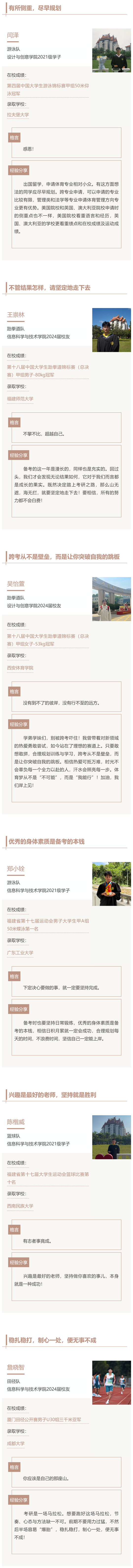 近年來(lái),廈門(mén)大學(xué)嘉庚學(xué)院學(xué)生在省運(yùn)會(huì)、全國(guó)大學(xué)生體育競(jìng)賽中屢獲佳績(jī),武術(shù)隊(duì)、游泳隊(duì)先后在全國(guó)大學(xué)生錦標(biāo)賽中摘金,跆拳道隊(duì)更是蟬聯(lián)三屆全國(guó)大學(xué)生錦標(biāo)賽團(tuán)體冠軍!這些體育成績(jī)的取得為學(xué)生跨專業(yè)考研奠定了扎實(shí)的實(shí)踐基礎(chǔ)。