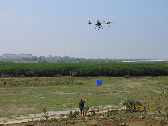 無人機噴灑技術(shù),即利用P150無人機模擬防病蟲害噴灑任務(wù),這項技術(shù)可大大提高噴灑效果和防除效率。無人機采樣技術(shù),即使用廈大開發(fā)設(shè)計的T20無人機采樣設(shè)備進行采樣。此項創(chuàng)新技術(shù)實現(xiàn)采樣可視化,并能精準定位,有效解決了灘涂采樣行進困難的問題,為紅樹林研究提供了新的采集手段。困難地鉆土技術(shù),即使用專業(yè)鉆土設(shè)備對部分泥土堅硬的區(qū)域,進行土質(zhì)疏松與打孔作業(yè),為紅樹林的生長創(chuàng)造更好的土壤條件。無人機運輸技術(shù),即使用P150無人機搭配運輸系統(tǒng),將本次種植的部分苗木安全運至灘涂。