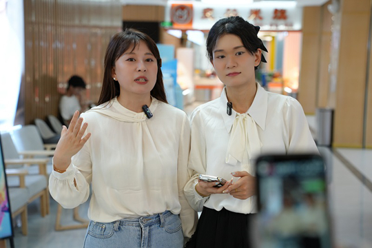 活動當天,特別邀請了傳媒系青年教師楊華和楊慧霞老師擔任主播,她們以熱情洋溢的講解和生動有趣的互動,帶領鏡頭前的觀眾們開啟了一段精彩的校園之旅。直播從新傳媒與藝術學院的南二創意樓開始,主播們詳細介紹了新傳媒與藝術學院的辦學理念和展廳中的優秀學生作品,及學院的優秀學生,讓大家對新傳媒與藝術學院有了初步的認識。