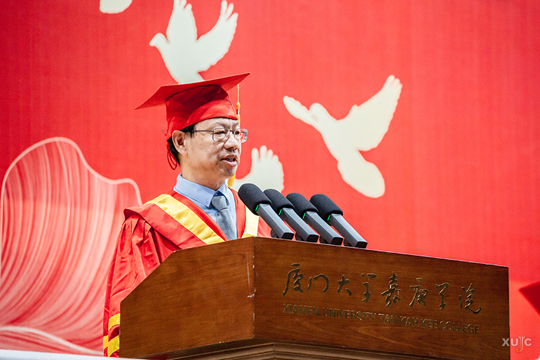 圍繞“破界創新、傳薪續火,駛向至善之境”這一主題,王瑞芳與畢業生們深入分享了三方面思考:社會需要什么樣的青年、如何順利實現從學生到社會人的轉變、嘉庚精神對當代青年有什么啟示。他一如既往地送上學校“敬業、合作、務實、創新”的八字理念,殷切希望畢業生們能勇敢面對挑戰、積極開拓進取,在新的人生征程中書寫屬于自己這代人的傳奇。最后,他深情寄語畢業生:“嘉庚學院永遠是你們溫暖的港灣。愿你們帶著這一份力量與底氣,在浩瀚的人生海域中,駛向屬于自己的至善之境。”