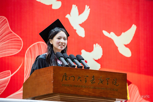“感恩‘嘉園’照亮我前行之路,助我從笨拙起步,到一路向陽。”畢業生代表、國際商務學院學子李艾琪深情回顧了在“嘉園”的點滴。一路走來,她蟬聯專業第一,獲得“中國銀行獎學金”“國家獎學金”,成為“嘉庚之星”。李艾琪將這份佳績歸功于學校提供的廣闊平臺、師長的悉心教導、同學的互助和嘉庚精神的指引。手握多所世界名校offer的她呼吁同學們:“讓我們帶著‘止于至善’的信念,以青春之名赴時代之約,在強國復興偉業中展現嘉庚學子的挺膺擔當。”