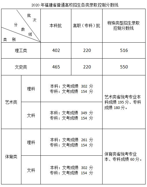 | 2020年福建省普通高校招生錄取控制分數線公布 |