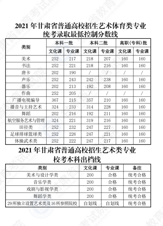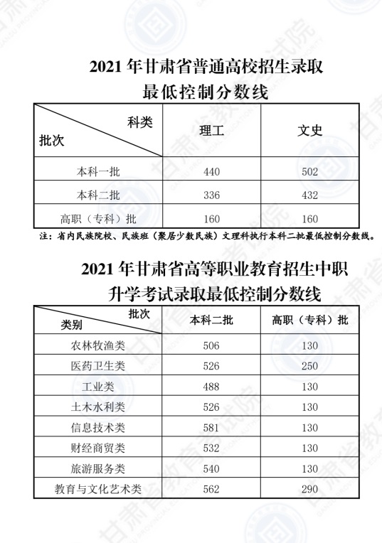 2021年甘肅省普通高校招生錄取最低控制分數線