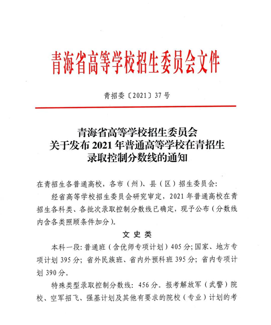 青海:關于發布2021年普通高等學校在青招生錄取控制分數線的通知