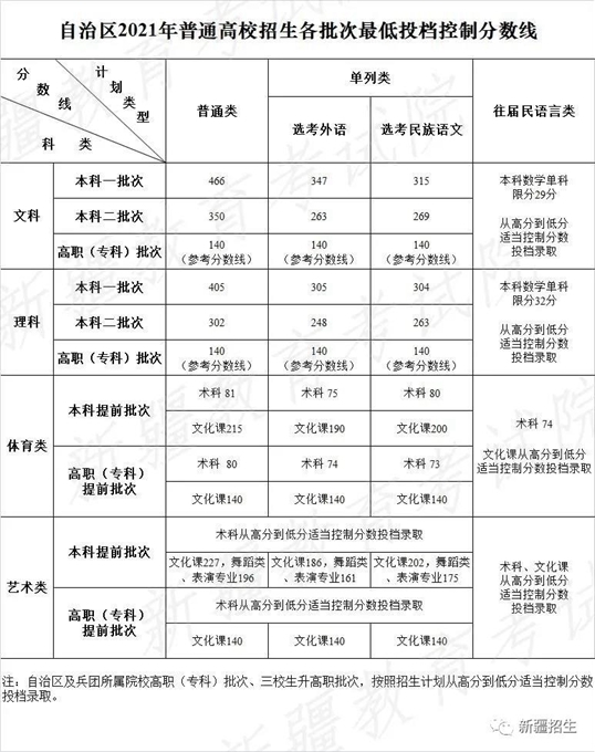 | 新疆2021年普通高校招生各批次最低投檔控制分數線確定 |