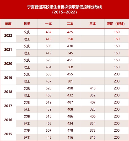 寧夏2022年普通高等學(xué)校招生各批次錄取控制分數(shù)線