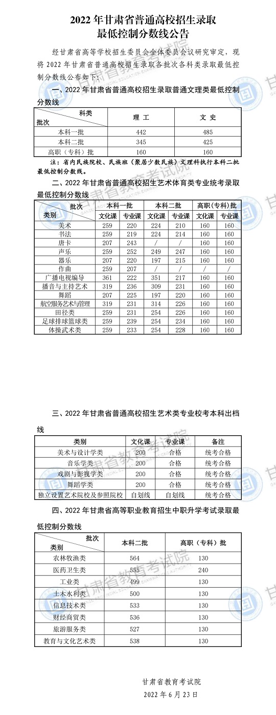 2022年甘肅省普通高校招生錄取最低控制分數線