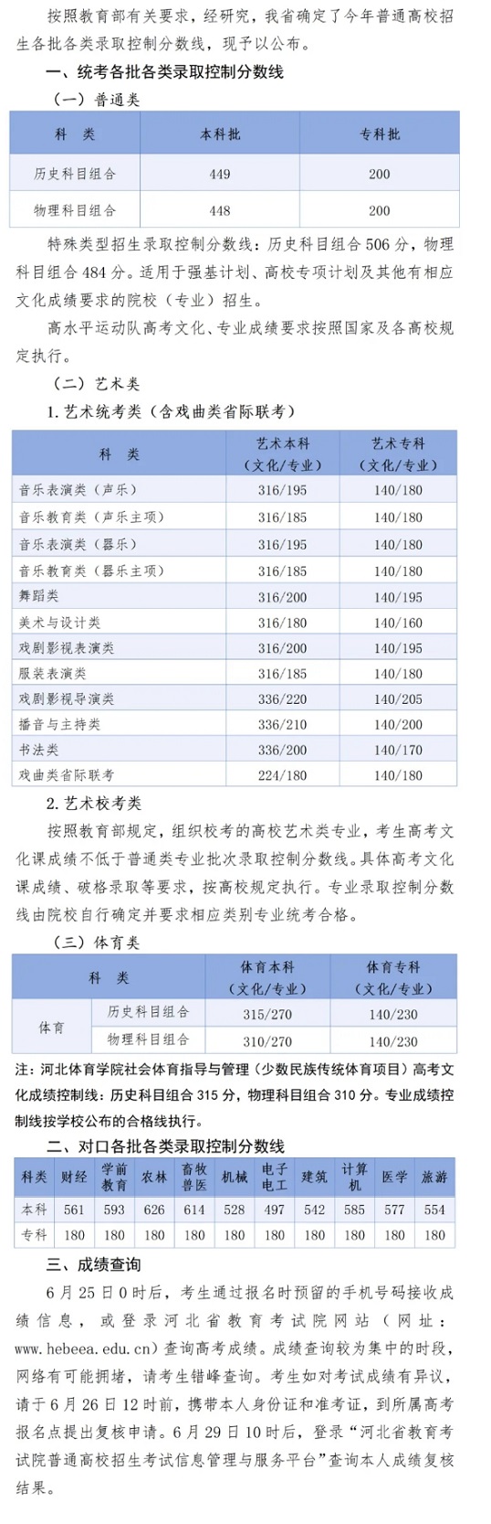 2024年河北省普通高校招生各批各類錄取控制分數線