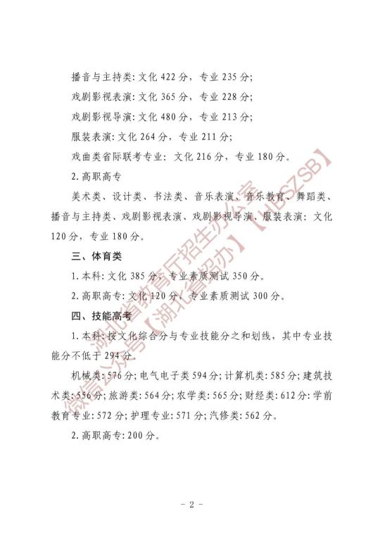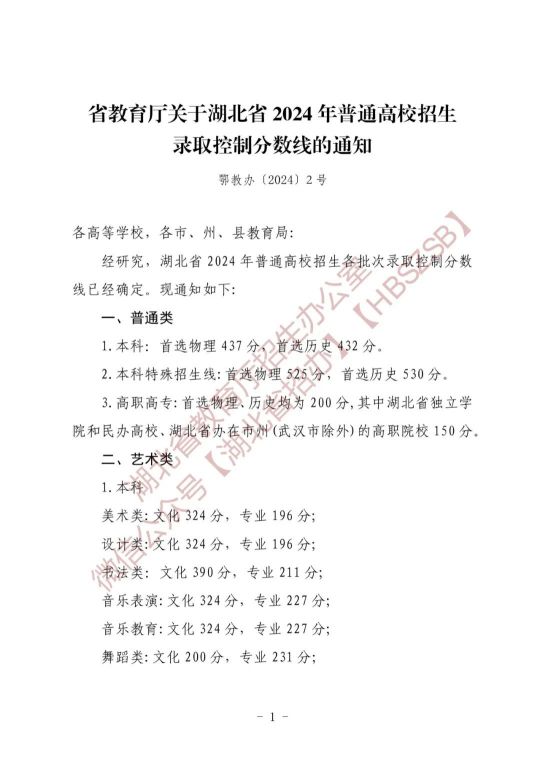 湖北省2024年普通高校招生錄取控制分?jǐn)?shù)線