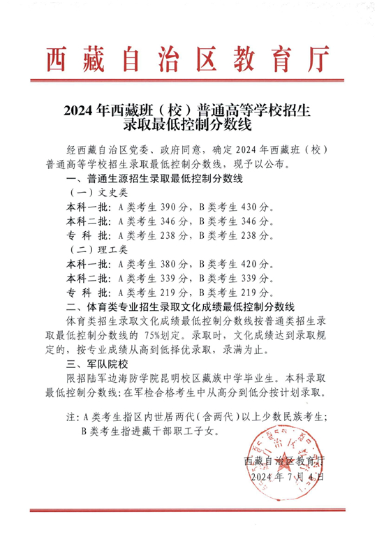 2024年西藏班(校)普通高等學校招生錄取最低控制分數線