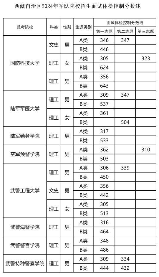 | 2024年軍隊院校在藏招收普通高中畢業(yè)生面試體檢控制分?jǐn)?shù)線 |