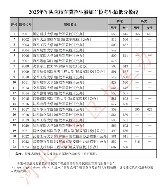 | 2025年軍隊院校在冀招生參加軍檢考生最低分數線 |
