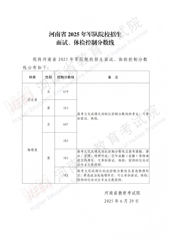 河南省2025年軍隊院校招生面試、體檢控制分數(shù)線