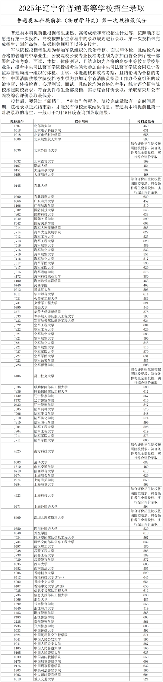 2025年遼寧省普通高等學校招生錄取普通類本科提前批(物理學科類)第一次投檔最低分