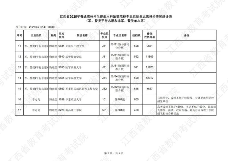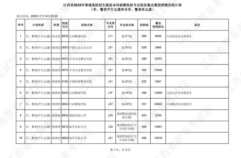 江西省2025年普通高校招生提前本科缺額院校專業組征集志愿投檔情況統計表(軍、警類平行志愿和非軍、警類單志愿)