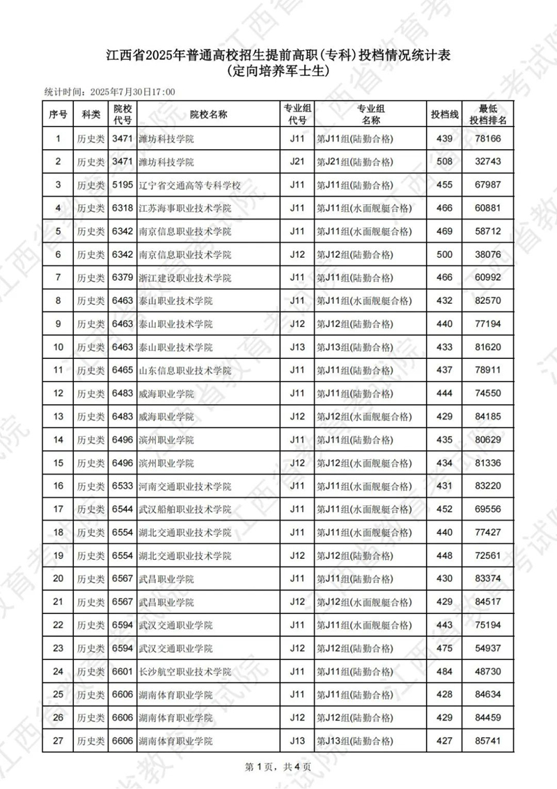 江西省2025年普通高校招生提前高職(專科)投檔情況統計表(定向培養軍士生)