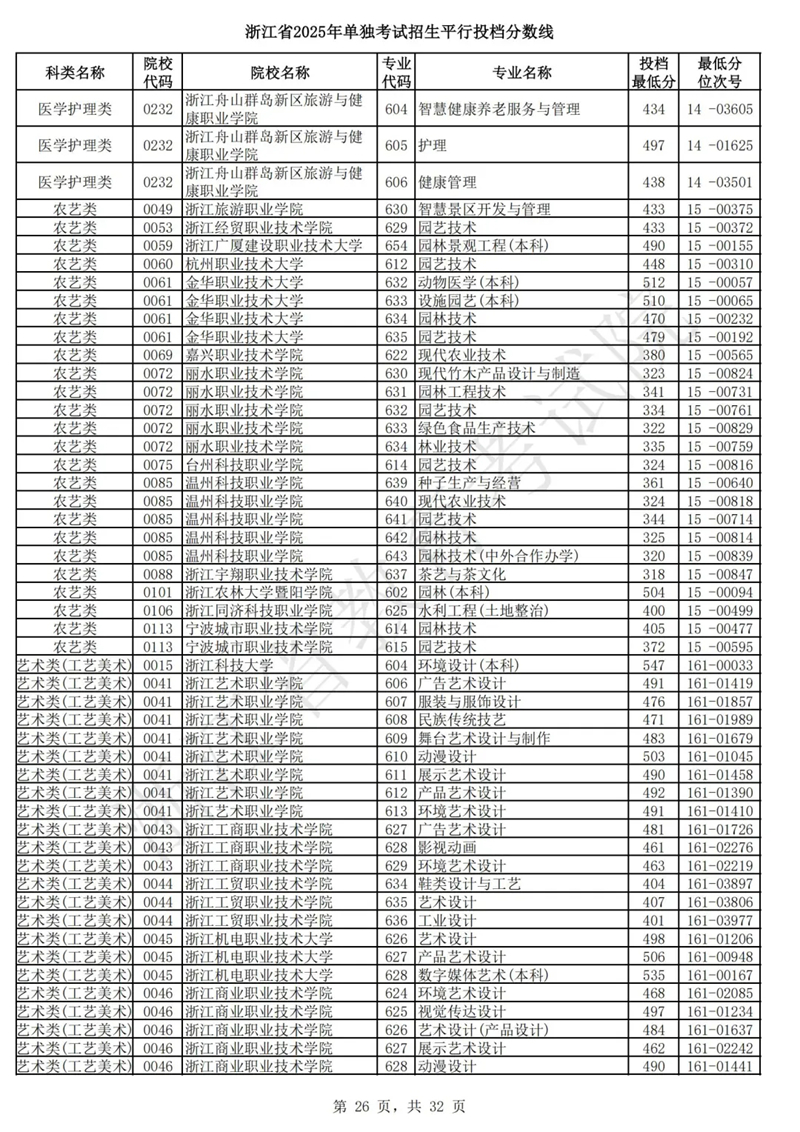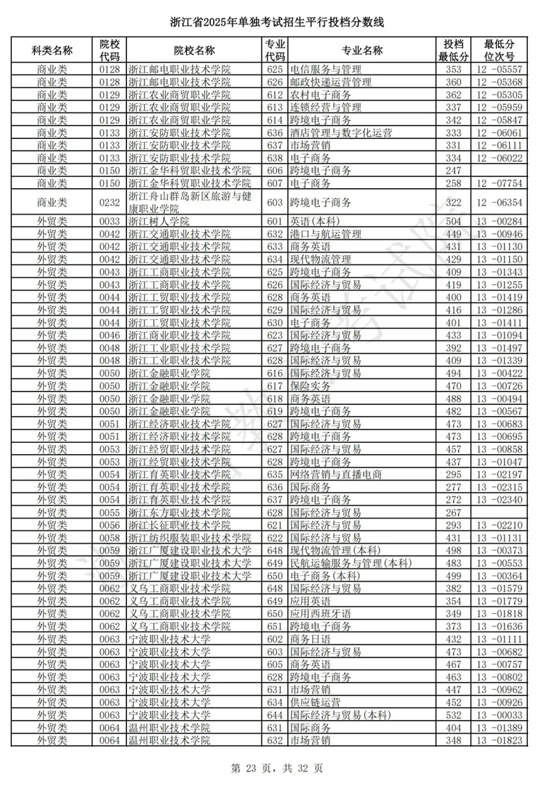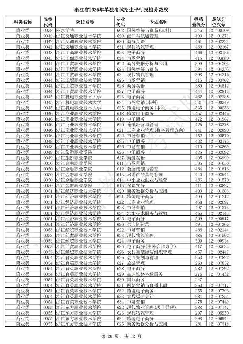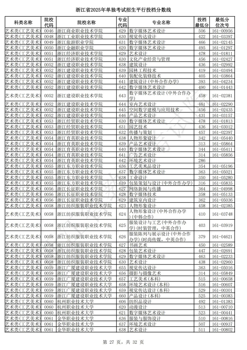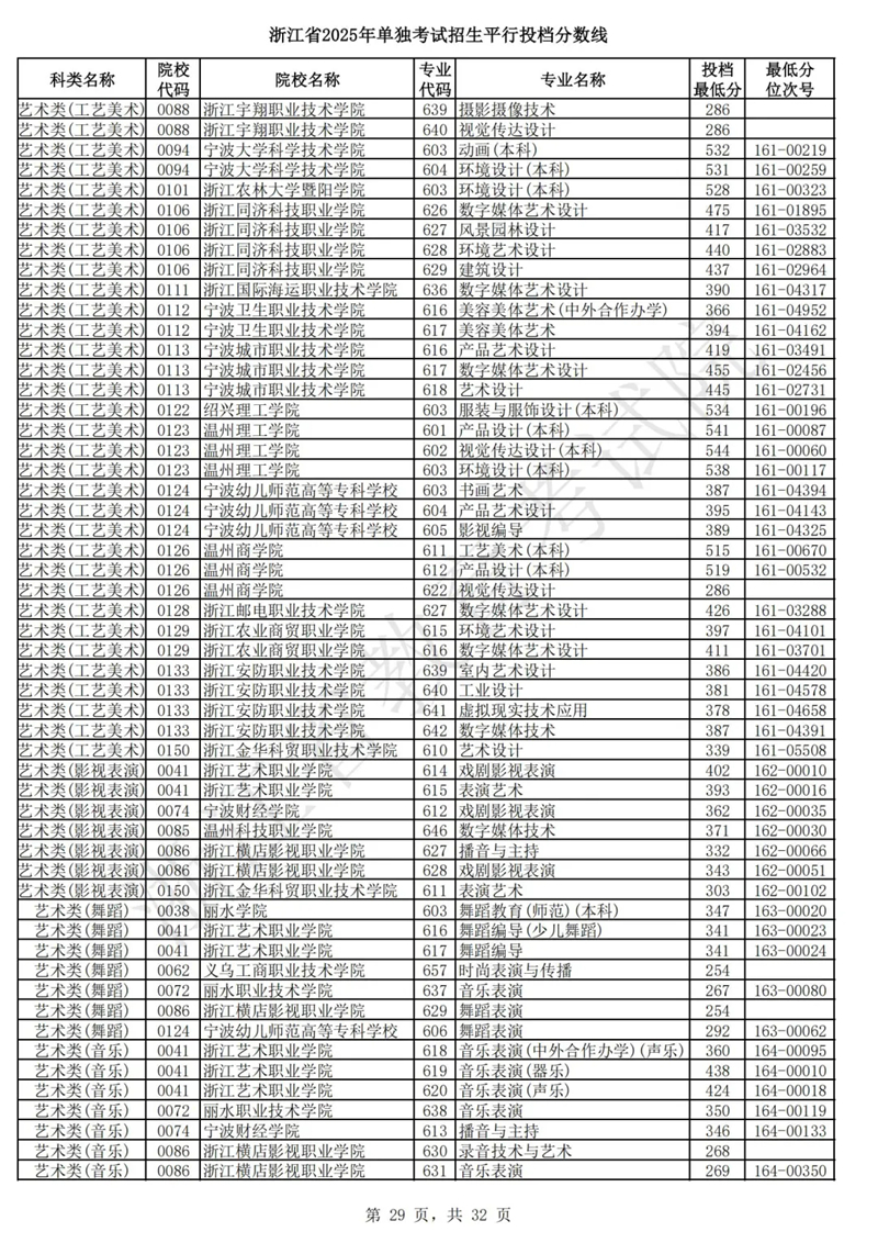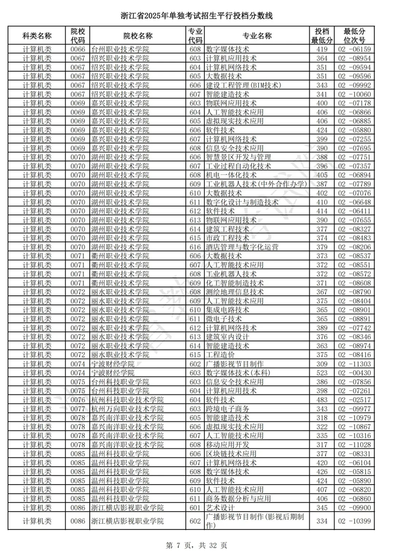 | 浙江省2025年單獨考試招生平行投檔分數線 |