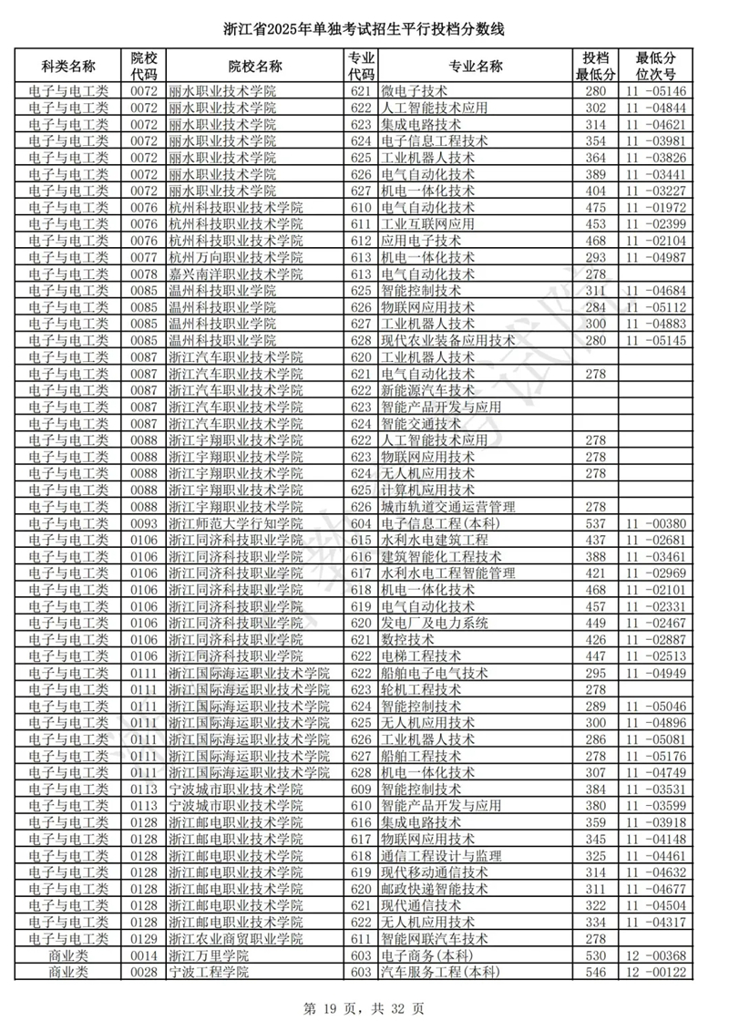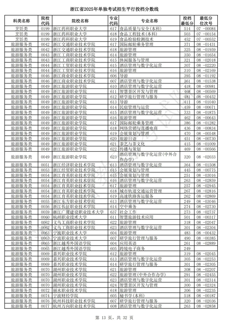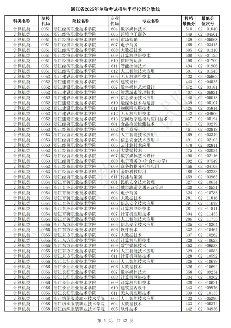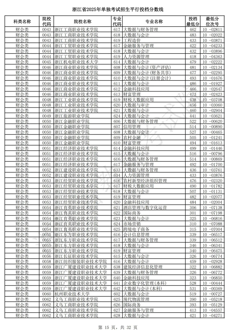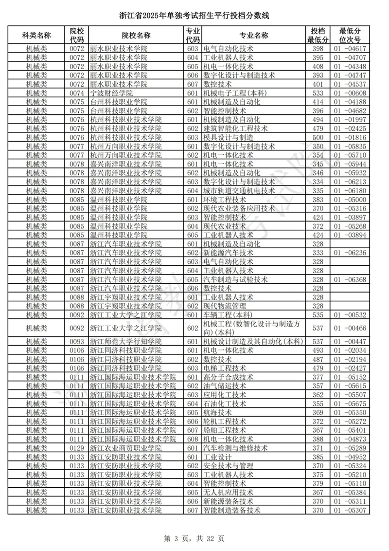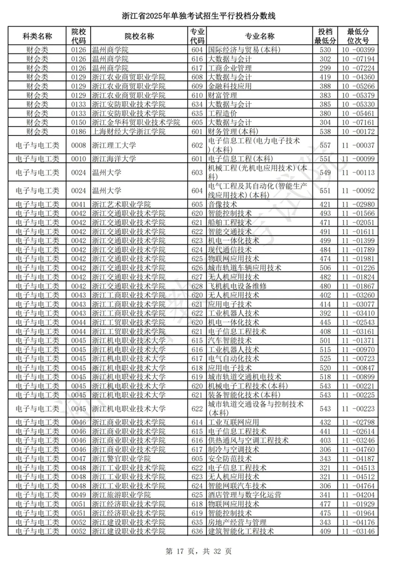| 浙江省2025年單獨考試招生平行投檔分數線 |