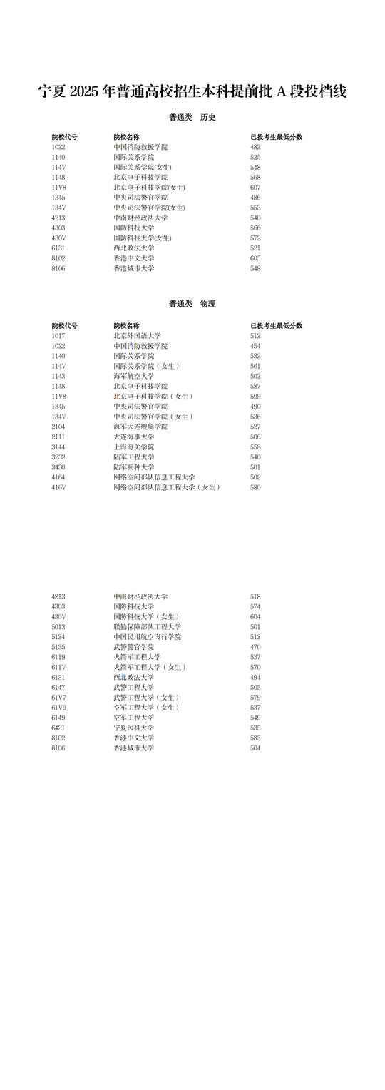 寧夏2025年普通高校招生本科提前批A段投檔線