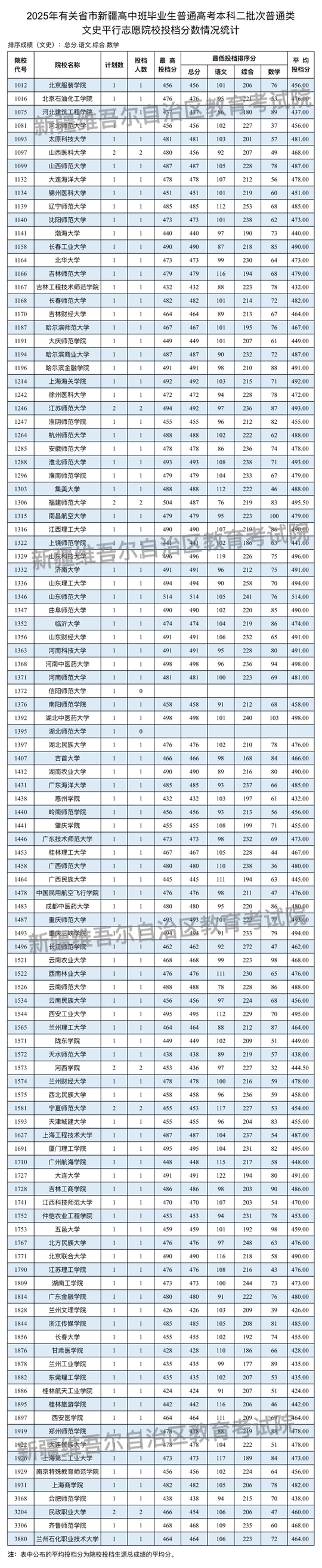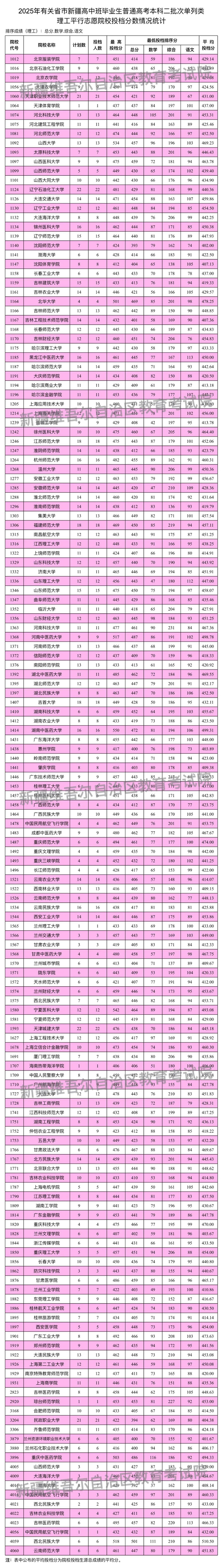 新疆維吾爾自治區2025年普通高校招收有關省市新疆高中班畢業生本科二批次投檔情況
