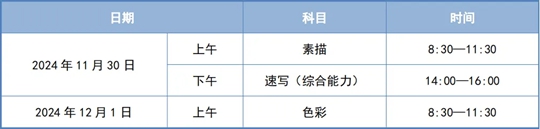 美術與設計類考試科目為速寫(綜合能力)、素描和色彩,每科100分,總分300分。考試時間如下: