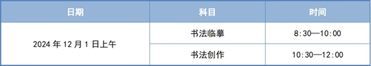 書法類考試科目為書法臨摹、書法創作兩個科目,每科150分,考試時間如下: