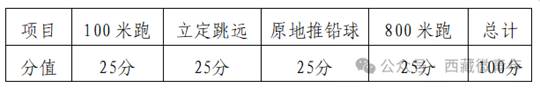 考試科目共有四項。分別是100米跑、立定跳遠、原地推鉛球、800米跑。