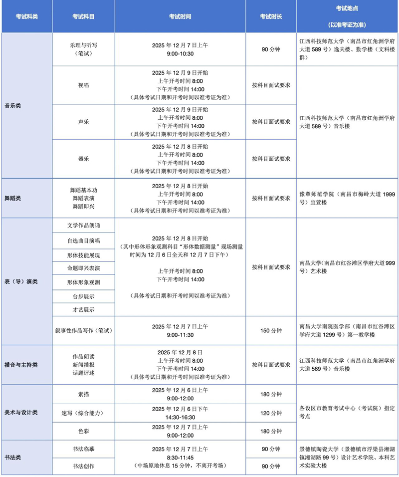 | 江西省2026年藝術(shù)類專業(yè)統(tǒng)考各科類(科目)考試時(shí)間、考點(diǎn)安排 |