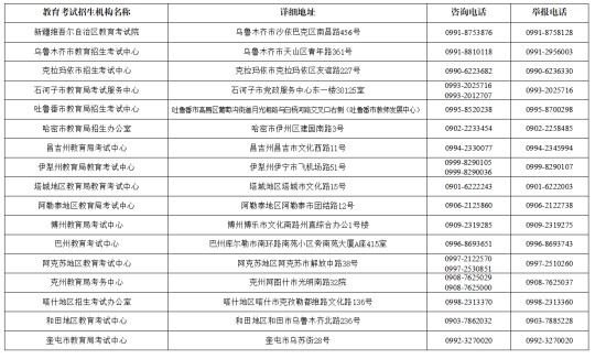 考生可登錄新疆教育考試院官方網站查看《關于印發〈自治區2025年普通高等學校招生體育類專業測試工作方案〉的通知》,詳細了解自治區2025年普通高等學校招生體育類專業測試報考條件及相關要求,按時按要求完成網上報名。考生如有疑問,可撥打高考報名所在地教育考試招生機構咨詢電話(詳見下表)咨詢。