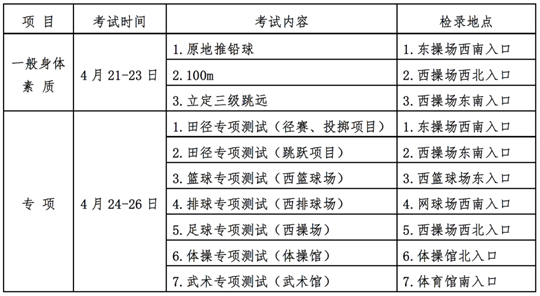 (四)測試采用分組輪換、集中測試的方式進行,4月21-23日為一般身體素質(zhì)測試,4月24-25日為專項測試,考生具體考試時間以《專業(yè)準考證》上公布為準。