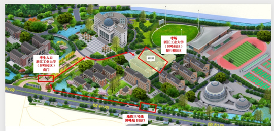 浙江工業(yè)大學(xué)屏峰校區(qū)(杭州市西湖區(qū)留下街道留和路288號),考生由浙江工業(yè)大學(xué)屏峰校區(qū)南門進入考點學(xué)校,學(xué)校南門距離地鐵3號線屏峰站B出口約300米、南門距離考場所在樓宇(健行樓B區(qū))約300米。考生的考場號和座位信息詳見準(zhǔn)考證。
