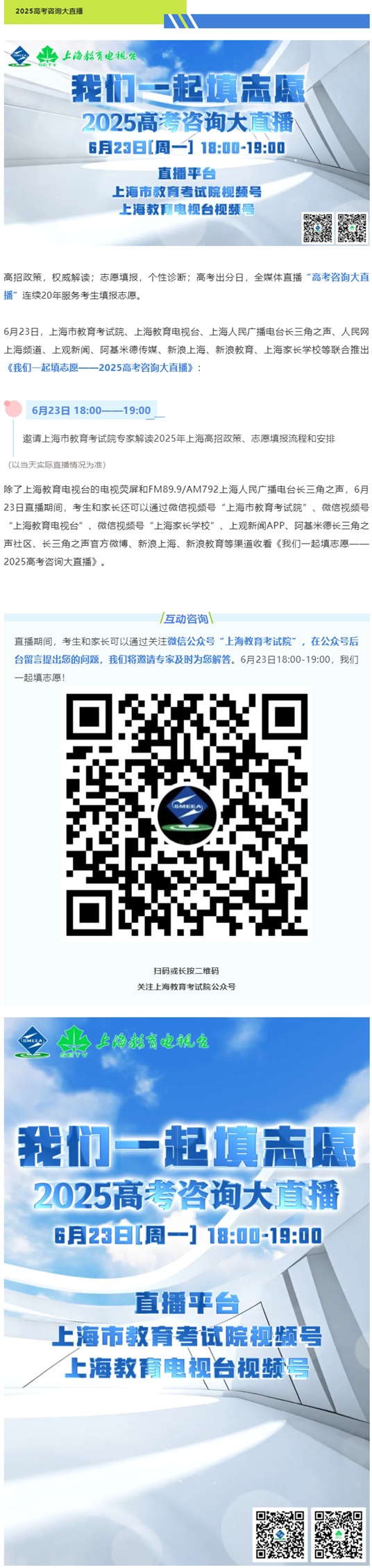 | 上海:6月23日,“我們一起填志愿”2025年高考咨詢大直播來了 |
