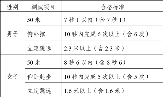 以上3個項目須全部進行測評。其中,有2個及以上合格的,體能測試結論為合格。體能測試實行全程錄像。