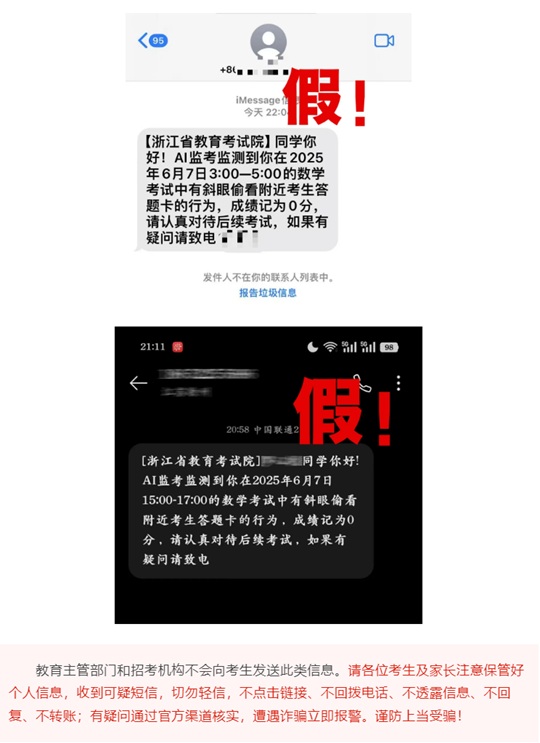 我省2025年高考正在進行中,部分考生收到了所謂“浙江省教育考試院”的短信,稱在考試中被AI監考發現其有違規行為,成績記為0分。